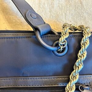 Materials: Nylon Twill, Poly Lining, Water Resistant Protective Finish, Brushed, Gold Hardware, Vegan Buffalo Leather Trim