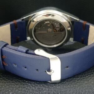 This watch has a stainless steel case in great condition with almost no flaws. The face features Red accents on a Blue Face giving an awesome vintage look overall. It also has a date function!
