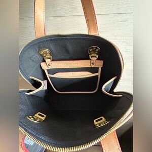 •It has a zip-top closure, brass hardware, and a nickel plated tag with the Dooney & Bourke logo.