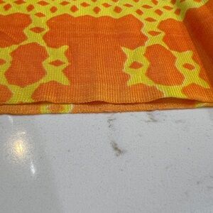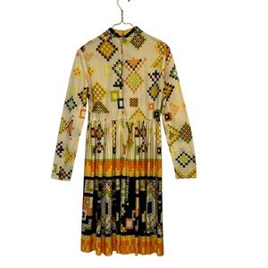 Striking vintage handmade long sleeve dress featuring a bold geometric print in cream, olive green, orange, and black with a distinctly retro 1960s–1970s aesthetic. The pattern has a quilt-inspired, mod folk feel that is characteristic of late-60s to early-70s textile design.