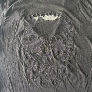 Edgy black tee with a unique distressed design. Short sleeves for casual style. Worn once, like new. Skull on back , low v neck front. 24” long with 19” bust. Raw hem and sleeve