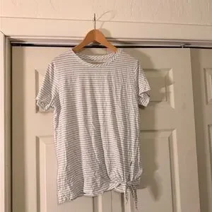 Eddie Bauer casual striped t-shirt with a tie-front detail. Features white and gray stripes. Size women’s L. Very cute, barely worn.