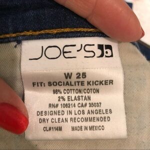 Joe’s Jeans Socialite Kicker Cropped Jeans. Dark blue wash. Finished with wide, topstitched hems and signature embroidery on the back pockets. Zip fly with button closure. Five-pocket style. Excellent preowned condition. Has a tiny hole on back pocket as shown in pic. Approximate Measurements: