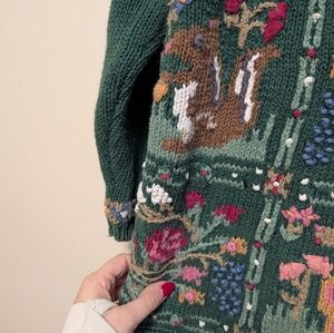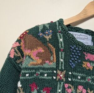 Hand-knit sweater by Signature by Northern Isles featuring an intricate spring-inspired panel design. The knit showcases detailed floral and woodland-style motifs arranged in framed sections, giving it a storybook, seasonal feel without being costume-like. The patterning is balanced with a rich green base, making it wearable while still visually special.