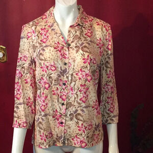 100% washable silk flora blouse. Bottom front and 3/4 sleeve. NWT and extra button