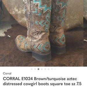 Unique Corral boots with Aztec design. Distressed brown leather with turquoise details. Square toe style.
