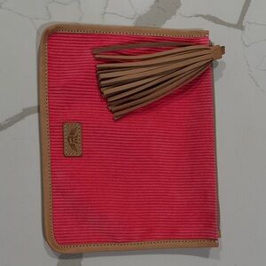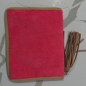 Vibrant pink mini bag. Tan trim and tassel. Stylish and compact. Brand new received as a gift.