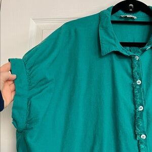 Chic teal button-down shirt by Umgee. Features short sleeves and a classic collar. Perfect for casual or dressy occasions.