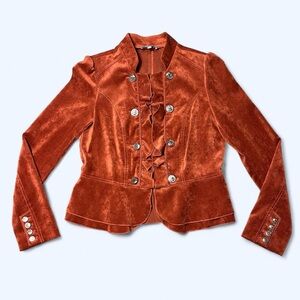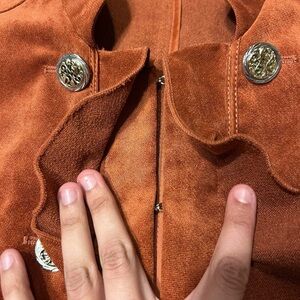 has 5 hook & eye closures down the middle, 8 engraved silver buttons on the torso, ruffles on the middle and bottom hem, a burnt orange color, faux suede material, and very little stretch!