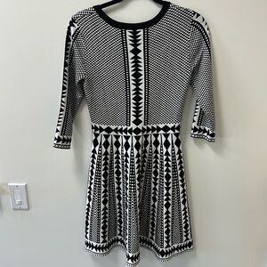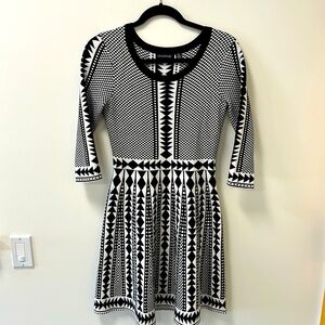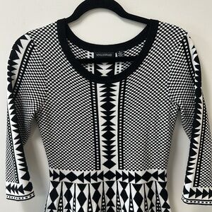 Beautiful, chic and classic, this NL sweater dress features a flattering geometric pattern, 3/4” sleeves and offers a nice stretch. Sz S. Measurements and fabric info in pics 🎄
