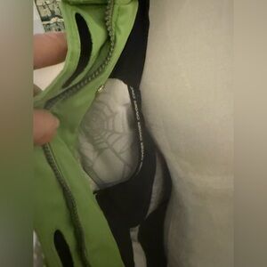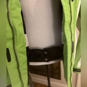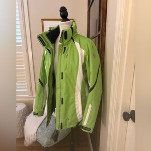 Ski jacket by SPYDER, a company well-known for high-performance winter sports apparel. It features a vibrant lime green body with prominent white side panels and black accents.