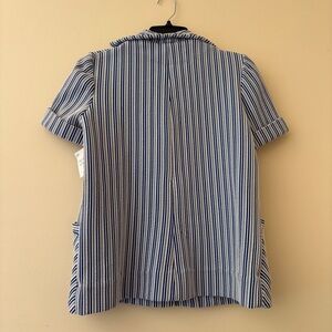 This charming true vintage smock-style blouse features classic vertical blue and white striping, short cuffed sleeves, a wide collar, and functional front pockets. It buttons all the way down the front with classic white buttons and has a gently flared silhouette. A timeless piece that could have been a house dress top, uniform blouse, or smock—now perfect for a modern cottagecore, retro, or workwear look.