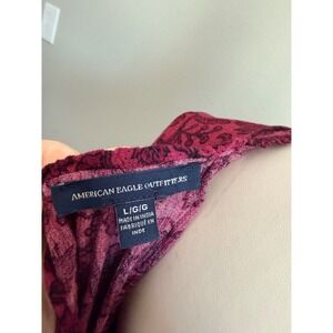 Capture effortless bohemian charm with this vibrant American Eagle Outfitters dress. Delicate floral patterns in deep plum adorn a rich fuchsia base, creating a visually captivating design. The flattering keyhole neckline with a subtle tie and playful tassel adds a touch of flirty detail, while the tiered ruffle skirt creates beautiful movement and a whimsical silhouette. Bell sleeves with ruffled cuffs lend a retro flair, making this dress perfect for a sunny weekend brunch, a casual music festival, or a relaxing beach vacation.