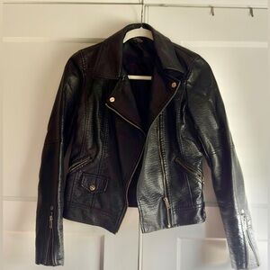 Sleek black faux leather jacket. Features gold zippers and hardware.