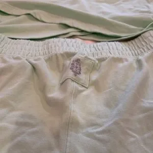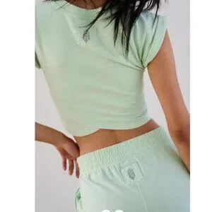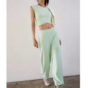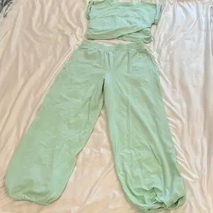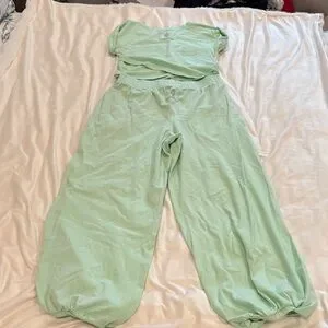 Soft light green set with short-sleeve top and loose pants. Ideal for relaxing.