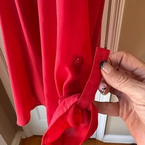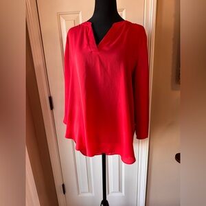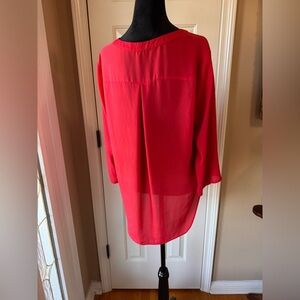 Bright tulip red blouse with a V-neckline by Chaus New York. Three Quarter sleeves with adjustably to half sleeve and flowing fit. High low hem. Perfect for adding color to your outfit.