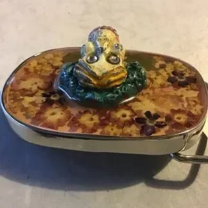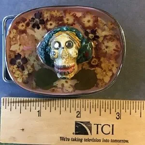 Unique belt buckle with Mexican Day of the Dead design. Features dried flowers set in resin with a high-relief macabre skull with crystal eyes. Set in heavy silver tone metal.