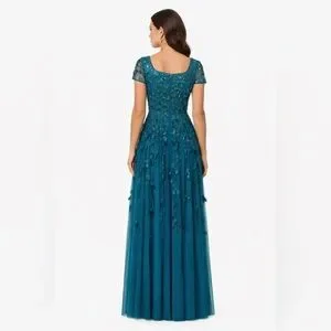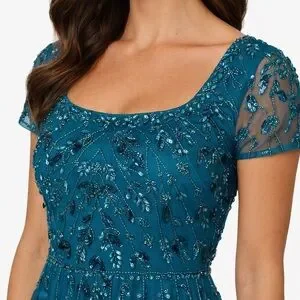 Elegant and timeless Adrianna Papell evening gown in a rich teal blue, brand new with tags. This formal dress features allover beaded vine embroidery with subtle sequins, creating beautiful texture and sparkle. Designed with a flattering scoop neckline, sheer beaded cap sleeves, and a defined waist that flows into a graceful A-line silhouette.