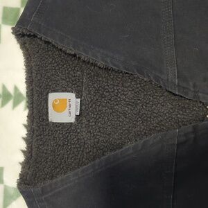 Dark blue Carhartt vest featuring cozy sherpa lining. Includes front pockets and a sturdy zip closure. Smoke free home!