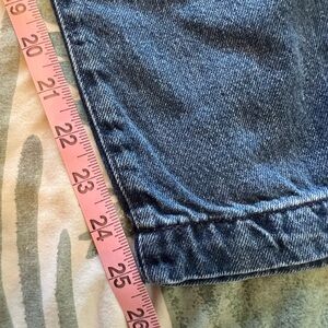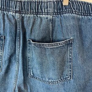 Mid-rise, SuperSoft Pull-on Barrel Jeans. Comfortable relaxed fit. Elastic waistband with drawstring. Tapered leg. Heavy weight but soft with good stretch. Worn and washed a handful of times.