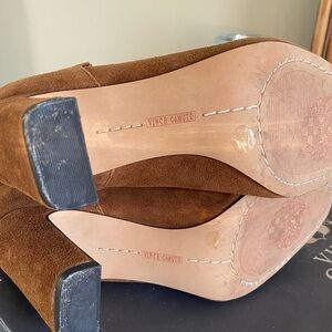 Tan (camel color) suede heeled boots. Pull on style with soft shaft. Minor wear on suede on both exterior sides only. Comes with original box.