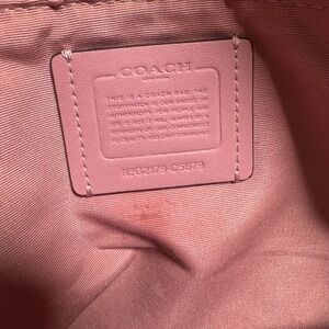 Elegant Coach backpack with iconic brown pattern and pink details. Ideal for daily use.
