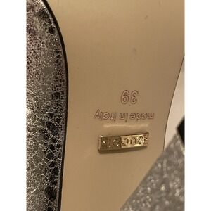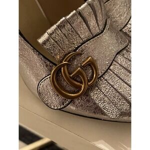Gucci Silver Foil Leather GG Marmont Fringe Detail Block Heel Size 39, 4" Heel