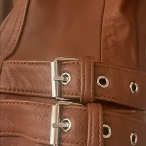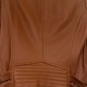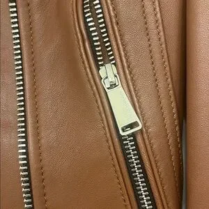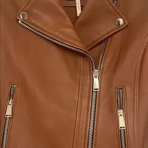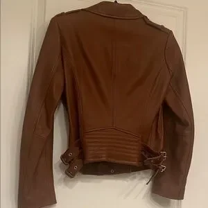 100% leather moto jacket with asymmetrical zipper and buckles on the sides. Faint small water marks only visible when unzipped, see last picture. Barely noticeable. Otherwise great condition, barely worn.