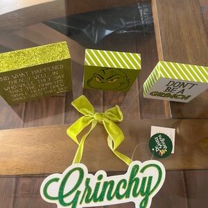 Festive Grinch-themed decor set. Features vibrant green accents. Perfect for holiday decoration.