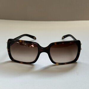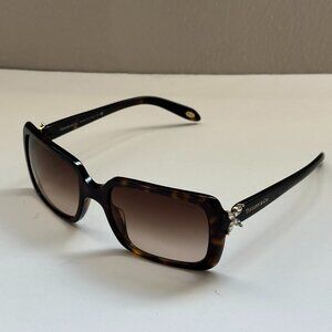 These Tiffany & Co. TF4047B women's rectangular sunglasses feature a brown tortoiseshell frame and gradient lenses with crystal embellishments on the temples.