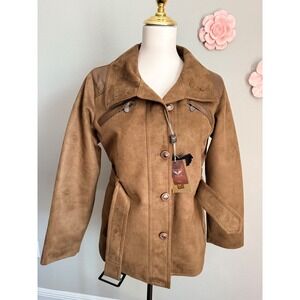 Keywords: suede jacket, belted coat, fashion jacket, outerwear, fall fashion, winter wear, casual outerwear, stylish coat, women's jacket, brown coat, faux suede, leather trim, button front, utility, safari, new with tags, gorpcore, high collar, westerncore, cowgirl chic