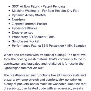 Upgrade your wardrobe with the Twillory Men's AIR Blue Suit. What's the problem with traditional suiting? The heat! We took the cooling mesh fabric that’s commonly found in sportswear, and upscaled and retailored it for use in The Air Suit. The Air Suit functions like all Twillory Suits and Blazers; extreme stretch and comfort, no wrinkles, plenty of pockets, and is machine washable. Don't be that dressed-up overheated dude with an overused sweaty tissue in your pocket - stay cool and airy all day long!