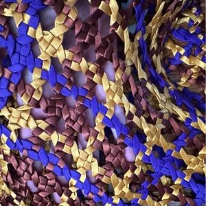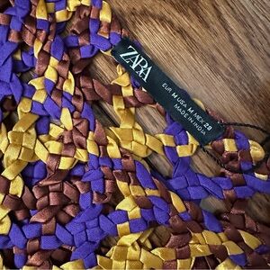 Crochet woven satin effect top with long fringe. Purple, burgundy red and gold.