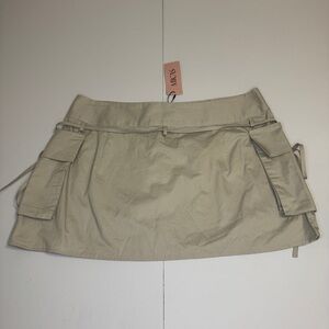 Step into trend-forward fashion with this brand new MICAS beige utility cargo mini skirt in size XL. Designed with a flattering mid-to-high rise fit, this skirt features oversized flap cargo pockets, adjustable side ties, and a front tie waistband with hidden Velcro closure for a customized fit. Made from a soft and durable 95% polyester, 5% spandex blend, it offers a comfortable yet structured silhouette.