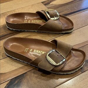 Elegant Birkenstock slides in tan suede. Accented with a bold gold buckle.