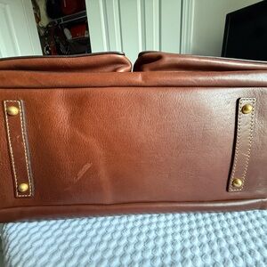 Elegant brown leather satchel in the beautiful and sophisticated Chestnut. Features vibrant red interior. Includes gold zipper accents. Pics also serve as description. Pet and smoke free home. Downsizing my closet. No returns. Measures 11.75 inches high, 14.5 in long, and 6.5 inches in diameter