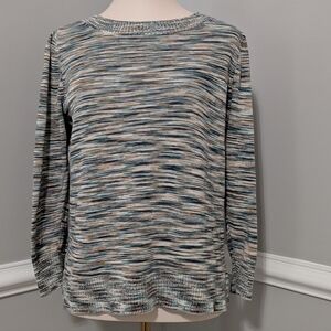 Stylish long sleeve top with multicolor stripes. Colors vary from navy and teal to tan and taupe. Perfect for casual wear or can be dressed up with navy pants. Size Large. Good condition.