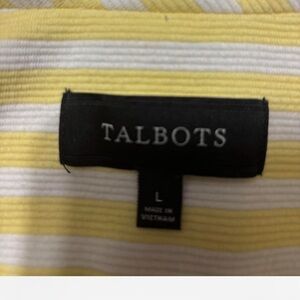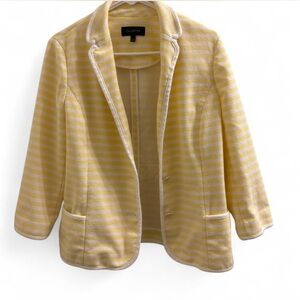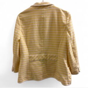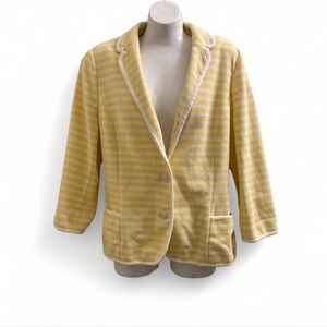 Talbots stylish yellow striped women's jacket with a comfortable fit. Perfect for adding a pop of color to your wardrobe. Versatile Talbot’s Yellow and white nautical striped blazer with pockets ,nautical buttons, 3/4 sleeves #stripes #nautical #CC PMED pit to pit 20” waist 19” Length 24” sleeves 7x18”
