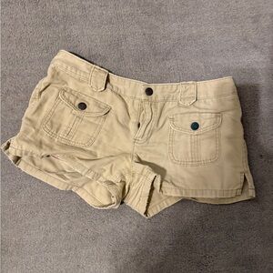 American Eagle Outfitters khaki cargo shorts in women’s size 4. Classic utility style with snap button closure and functional front pockets.