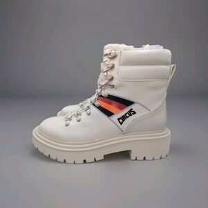 This style features a faux-sherpa trim, a chunky lug sole, and a striped detail on the side with "CIRCUS" branding. They are a lace-up bootie with a round toe and an inner ankle zipper closure.