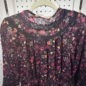 Like new charming LOFT floral print dress. This knee-length sheath dress features a V-neckline with a delicate button-front closure and long sleeves with a slight puff at the shoulder. The elasticized waist creates a flattering silhouette, complemented by lace trim details at the neckline, waist, and hem. Perfect for a casual day out or a garden party.