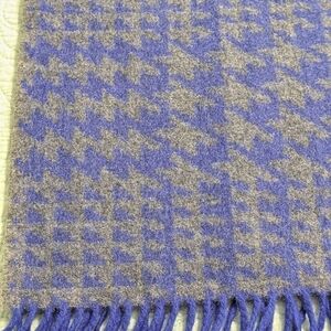 super soft cashmere blue and gray houndstooth scarf with fringe detailing. Perfect for adding a touch of elegance to any outfit.