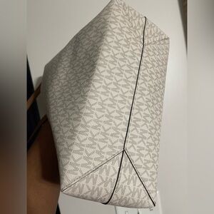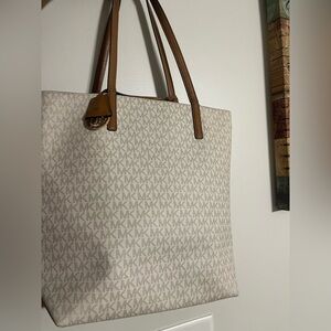 Stylish Michael Kors tote. Features signature MK pattern. Elegant tan handles and accents. Perfect for everyday use.