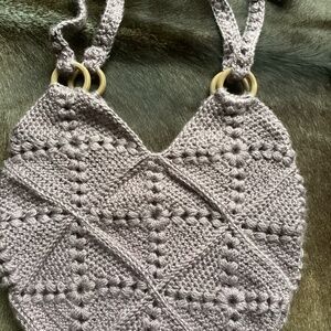 This beautiful bag appears to be handmade. It’s really unique. It’s a great lavender purple color. The knit is exceptionally soft and feels great. Longer crossbody strap wear with four round wood rings at the base. Good big bucket space. No maker tags found. If you are looking for a bag nobody else has this beauty is for you. It’s elegant, beautiful and unique all at once.