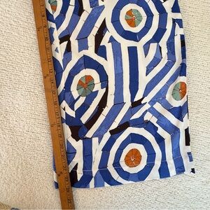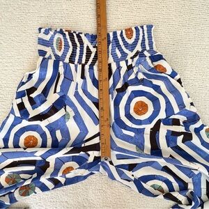 Just the cutest, stylish high-waisted wide leg pants with a geometric pattern in blue and white. Soft, silky, satiny, flowy casual, pull-on pants.