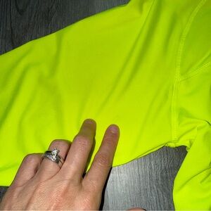 Keeping you safe during your outdoor workouts in neon yellow high visibility. This quarter-zip pullover features a zipper chest pocket + thumbholes. Definitely can be unisex but it was purchased in the men’s section: size medium. Please see photos for approximate flat measurements + some very faint spots I noticed while taking close up photos.