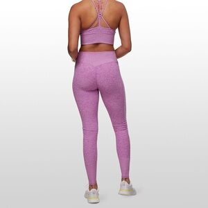 Alosoft leggings in color electric violet heather. Features high rise fit, ribbed detailing at waist and ankles, and contouring back seam to add lift and shape.