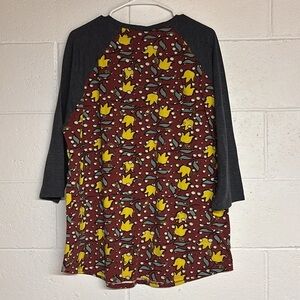 LuLaRoe top featuring a vibrant floral print. Rich red and yellow flowers with dark gray accents. Ideal for casual outings.