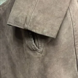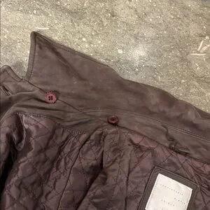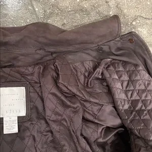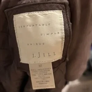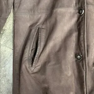 Medium brown leather chore/barn coat by J Jill, M. This is an older, vintage piece. There was a fur collar that went with this at one point, but I do not have it. There are buttons on the collar for that (a couple buttons missing). There is some wear on the cuffs as pictured. I wore this as a professional coat for a while and then it sat in my closet for years. It is too nice of a piece to go unloved.
