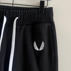 Zippers at ankle hems, drawstring waist. Thicker sweatpant material
